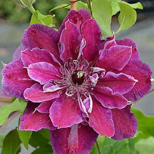 Цветки крупные, до 15 сантиметров в диаметре, окраска фиолетовая. Тычинки бело-пурпурно-розовые. Лепестки бархатистые и полумахровые. В среднем в цветке от 7-8 внешних лепестков и до 30 – внутренних.
