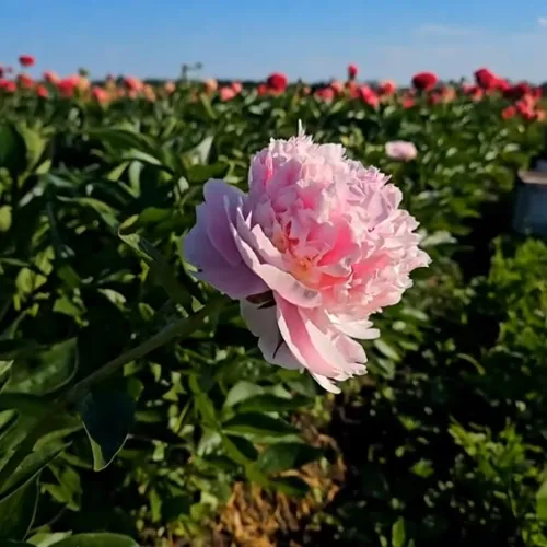 Период цветения приходится на конец мая — начало июня и длится 2–3 недели. Диаметр цветка составляет 16–20 см. Лепестки многорядные, широкие и слегка волнистые, формируют плотный и воздушный бутон. Окрас — нежно-розовый с перламутровым блеском, центр более насыщенного розового оттенка, что создаёт глубину и выразительность. Аромат лёгкий и сладковатый, приятный и ненавязчивый.
