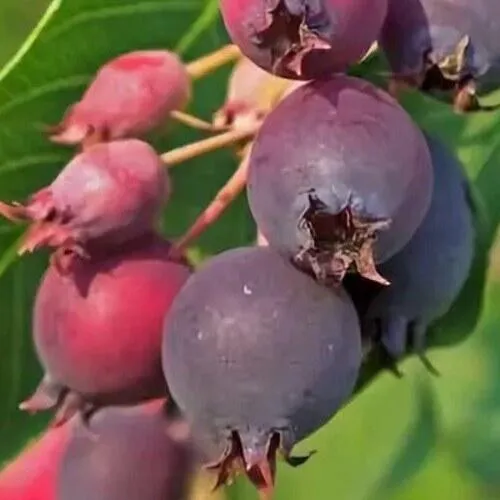 Ирга Мандан (Amelanchier Mandan) – компактный кустарник, вырастающий в высоту до 2 м. Крона – в виде свечки. Сорт получен путем селекции от канадского вида ирги. Плодоношение наступает на 3-4 году после высаживания в грунт. Ягоды большие, сладкие, в кистях по 10-12 штук. Вес ягод – до 0,9 г. Мякоть необыкновенно сочная. Созревание не массовое – плоды зреют постепенно. Относится к сортам со средним сроком созревания.
