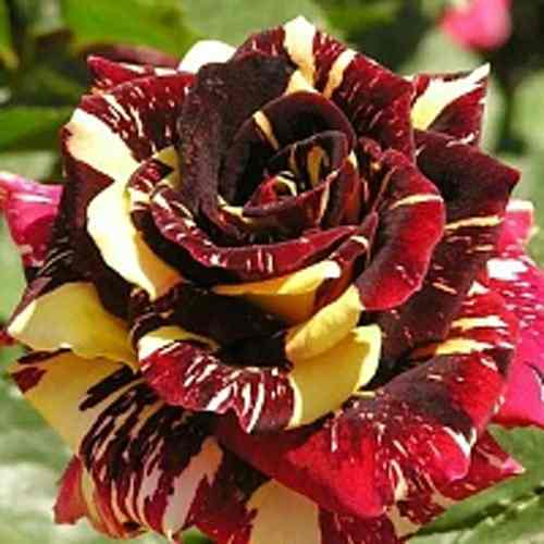 Роза Фокус-покус — необычный представитель семейства флорибунд. Пройти мимо него просто невозможно. Бордовые цветки его словно забрызганы желтой краской, что делает каждый цветок неповторимым, так как найти одинаковый рисунок невозможно, его просто не существует.  На одном цветоносе порой можно найти одну абсолютно желтую розу, или одну темно-красную розу. В соцветиях обычно бывает не более пяти цветков. Цветки среднего размера. В диаметре редко превышают 7 см. Куст хорошо разветвленный, высотой 70 см, в ширину — не более полуметра. Имеет хорошую устойчивость к болезням и морозам.